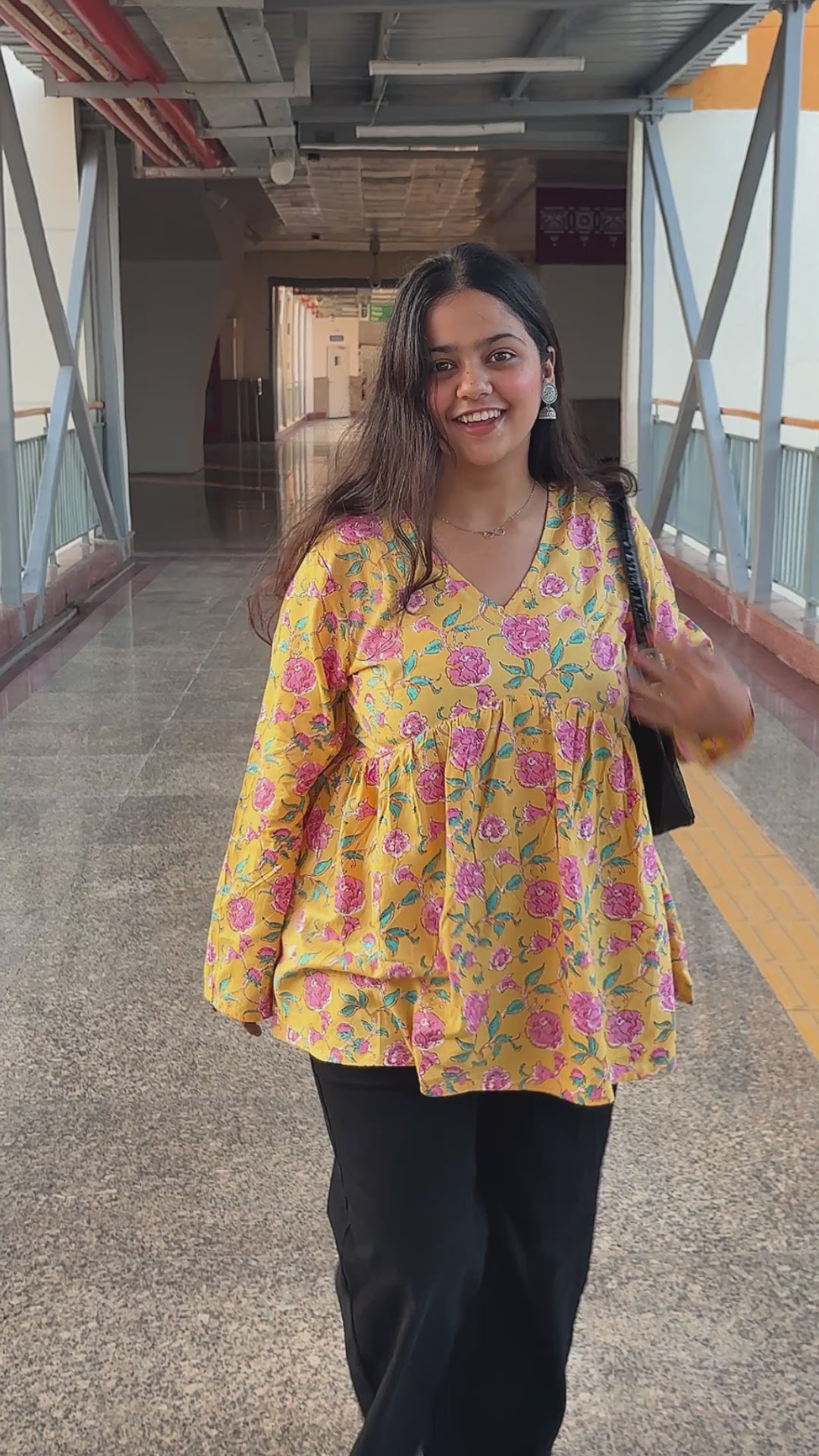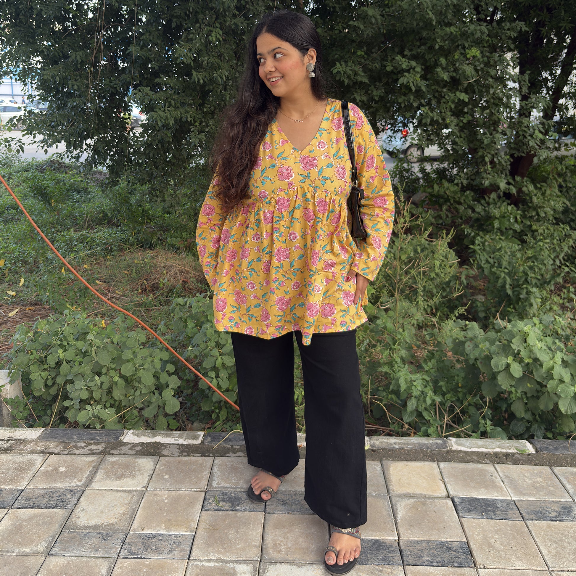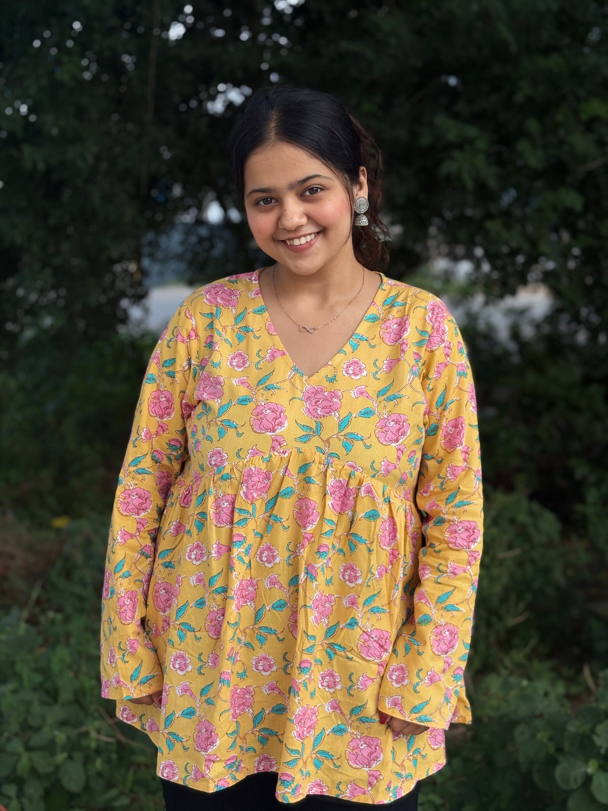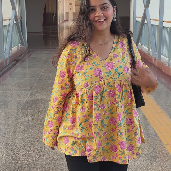 Upgrade your ethnic wardrobe with this yellow floral Alia cut short kurti for women, designed in breathable 60x60 cotton cambric fabric. Featuring a stylish V neck, long sleeves, and trendy floral print, this kurti is perfect for daily wear, office wear, college, or weekend outings. Its short length makes it easy to pair with jeans, leggings, or palazzos, giving you a versatile Indo-western look.