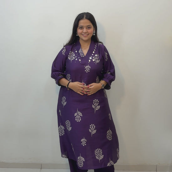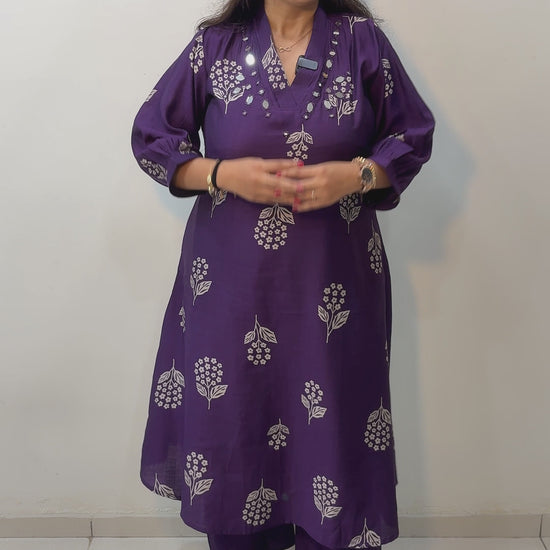 Women's Ethnic Purple Kurta Pant Set | V Neck Kurta Set | Floral Print Mirror Work Kurti | M to 3XL, A Line, Vatican Fabric | Aakruti by Boldnaari